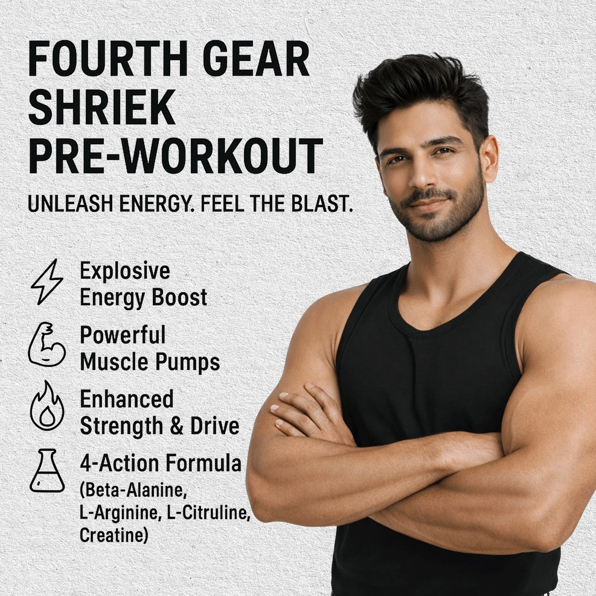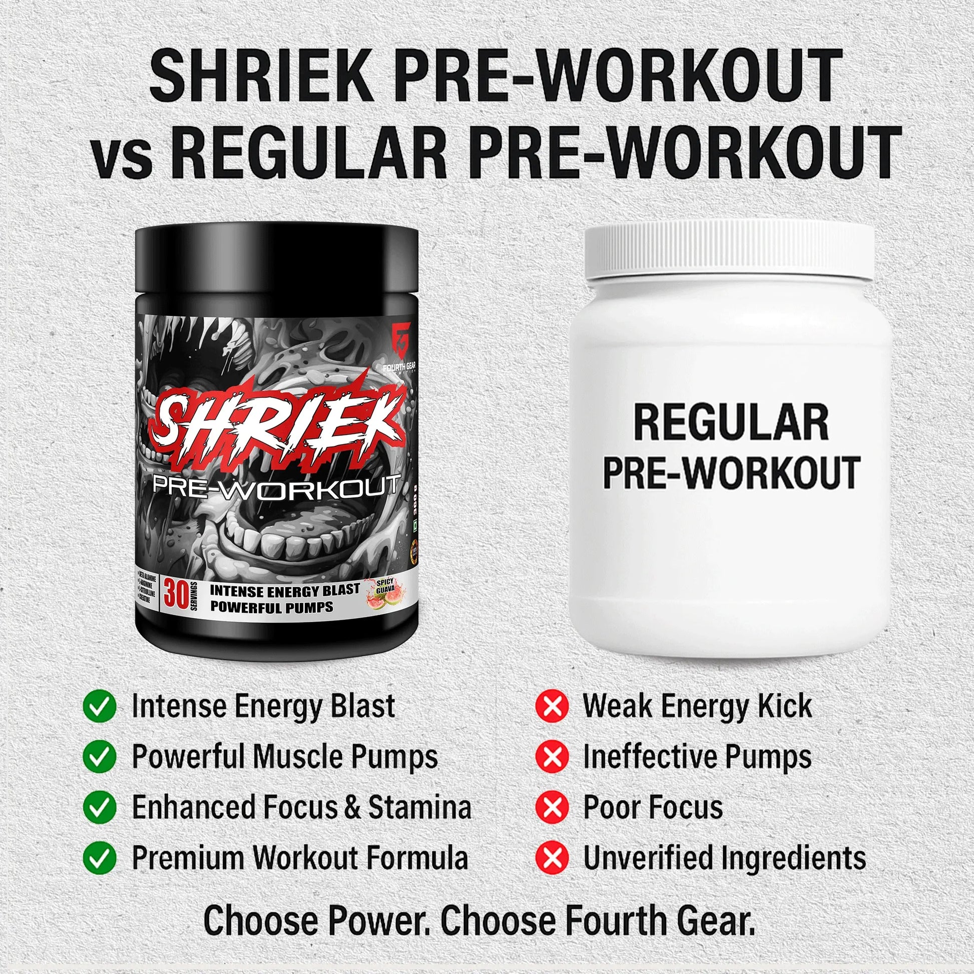 Fourth Gear’s SHRIEK Pre-Workout (Spicy Guava, 360 g) is a high‑stim powder crafted for serious gym-goers who demand intense energy, razor-sharp focus, and pumps that stand out.