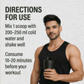 Mix one scoop in 200–300 ml of water 15–20 minutes before exercising for optimal results. -